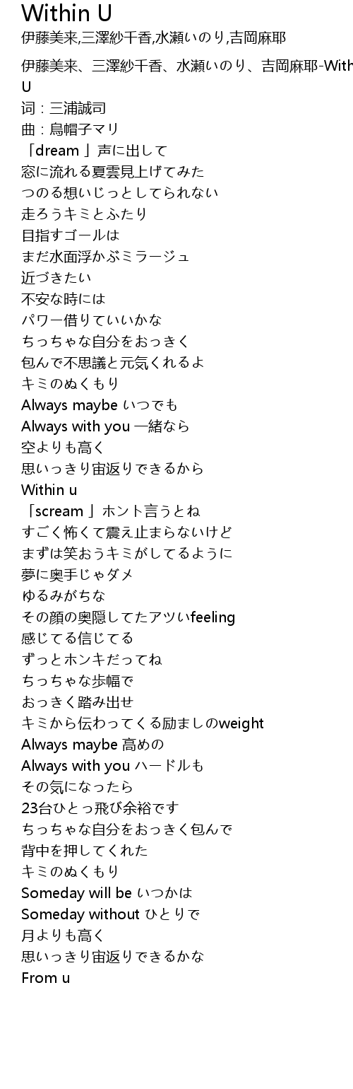 | [00:00.469] | 伊藤美来、三澤紗千香、水瀬いのり、吉岡麻耶-Within U |
