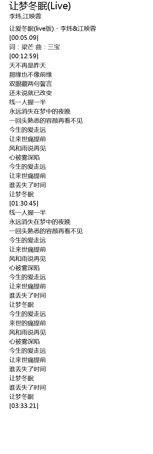 | [00:00.00] | 让爱冬眠(live版) - 李炜&江映蓉 |