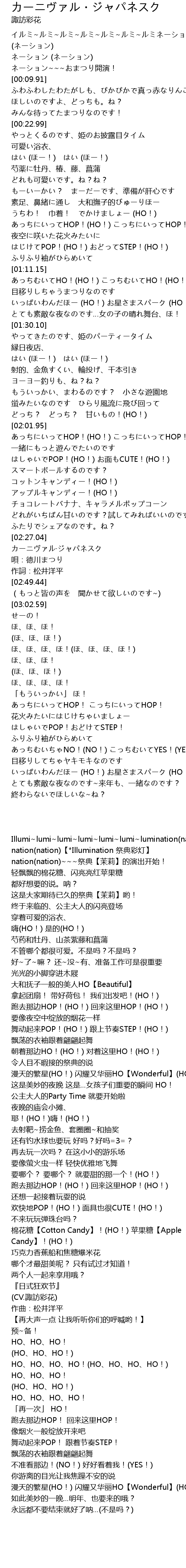 | [02:13.34] | コットンキャンディー!(HO!) アップルキャンディー!(HO!) |