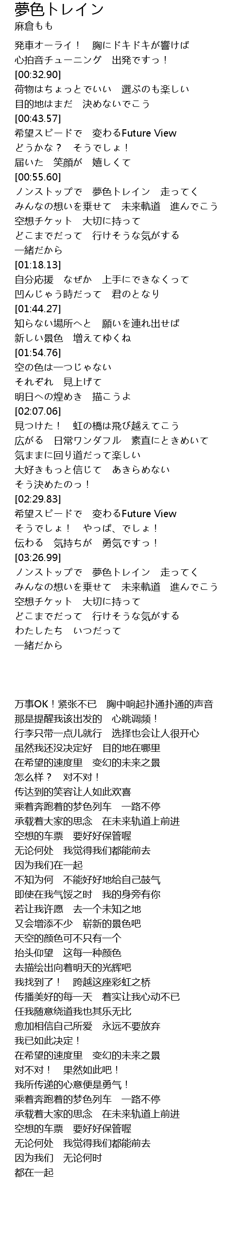 | [03:29.45] | ノンストップで 夢色トレイン 走ってく |
