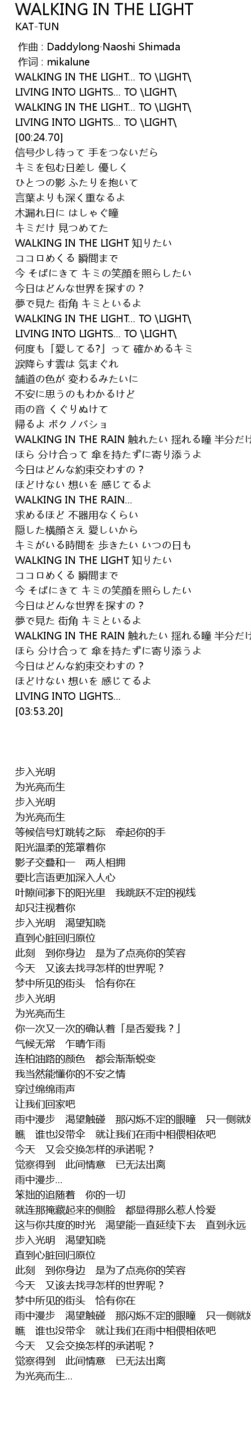 | [03:00.00] | WALKING IN THE LIGHT zhī |
