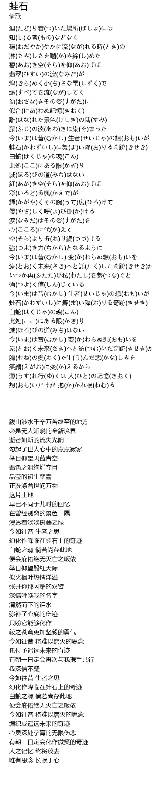 | [01:33.890] | 蛙石(かわずいし)に舞(ま)い降(お)りる奇跡(きせき) |