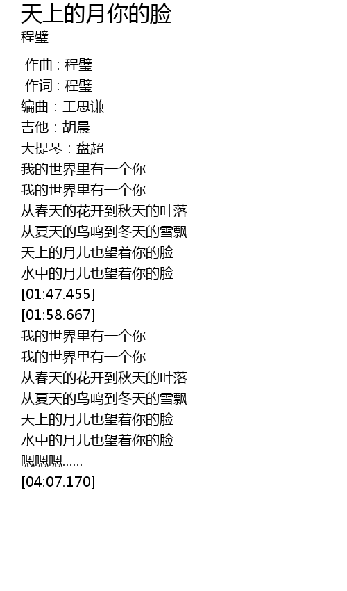 | [01:36.790] | 水中的月儿也望着你的脸 |