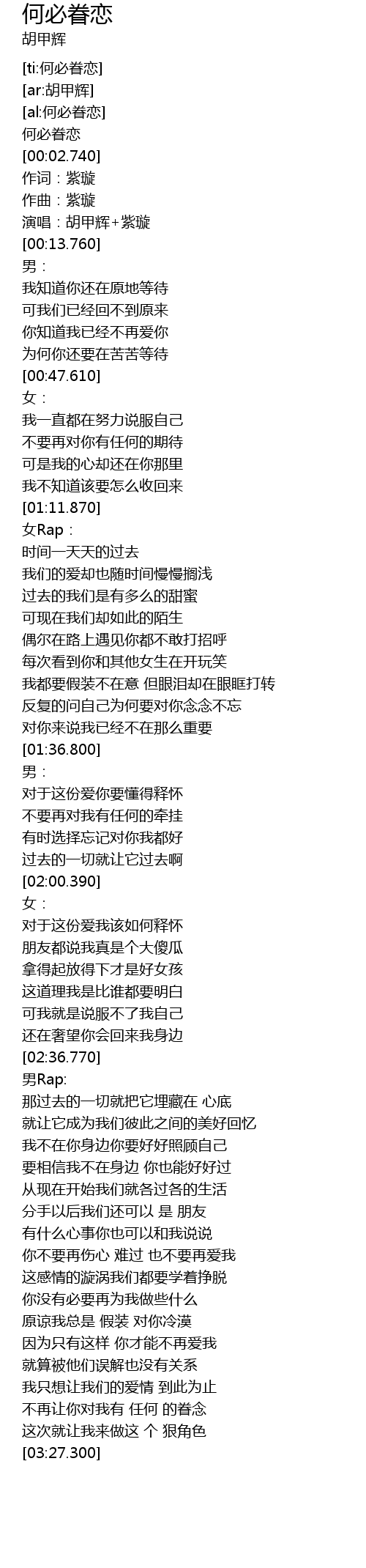 | [00:10.970] | 演唱:胡甲辉+紫璇 |