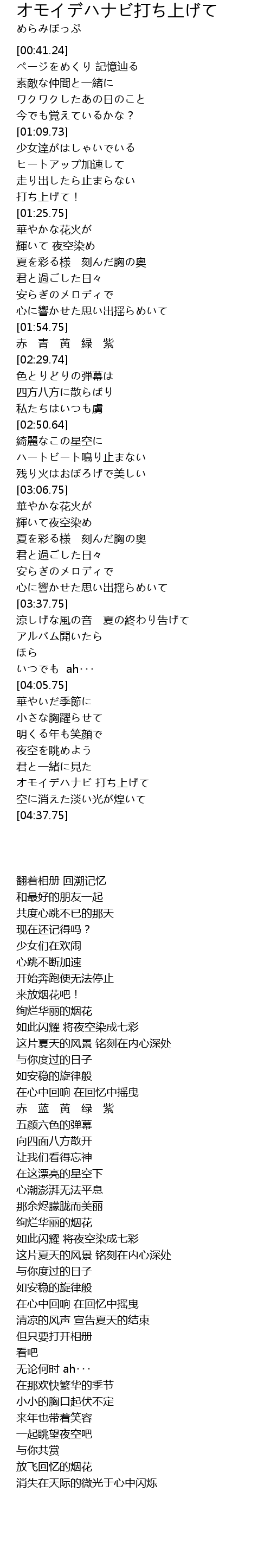 | [04:26.05] | オモイデハナビ 打ち上げて |