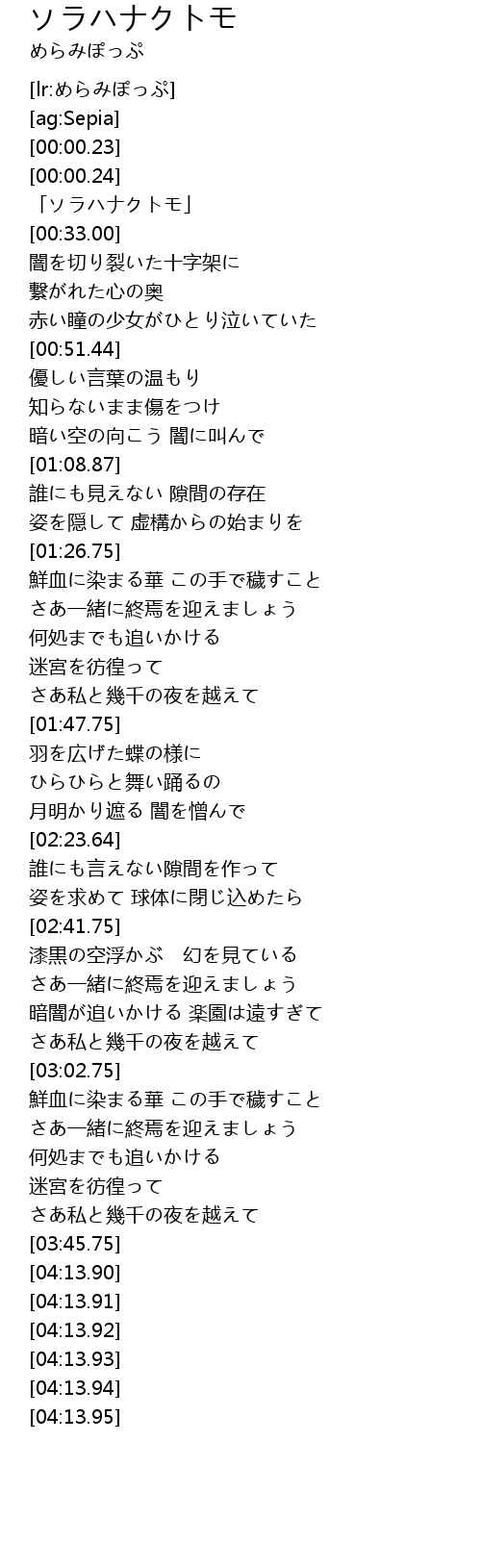 | [00:43.45] | 赤い瞳の少女がひとり泣いていた |