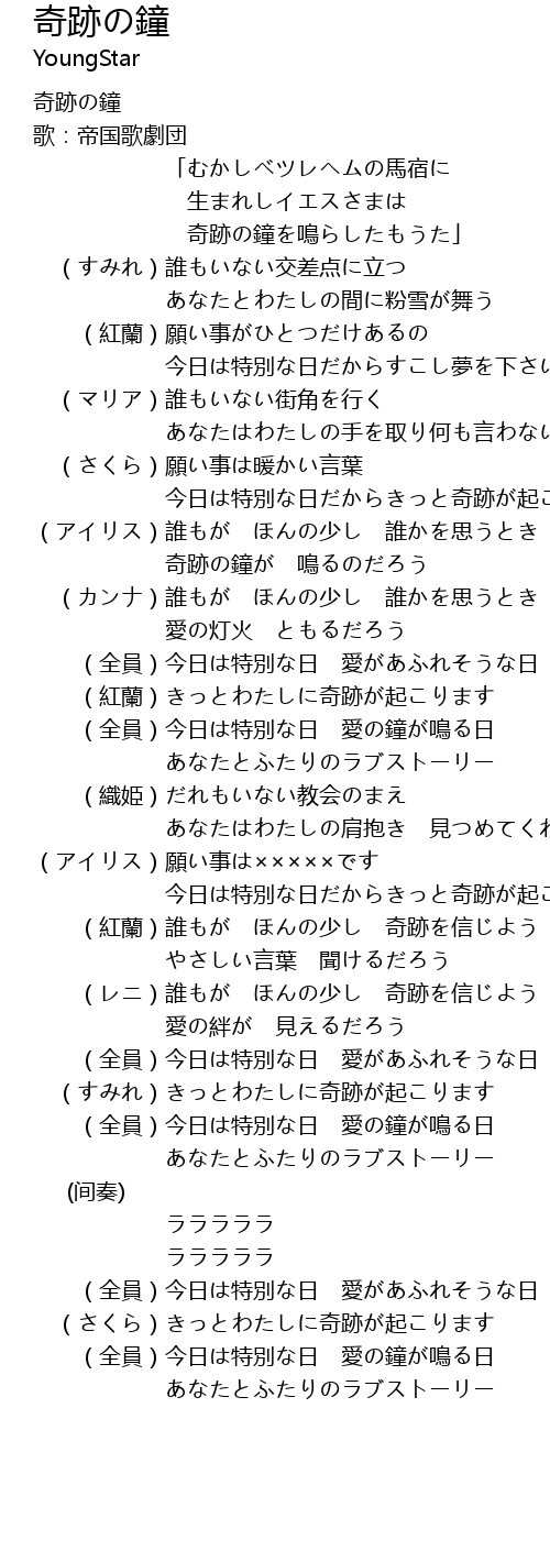 | [00:22.41] | 奇跡の鐘を鳴らしたもうた」 |