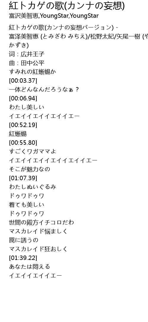 | [00:00.00] | 紅トカゲの歌(カンナの妄想バージョン) - 富泽美智惠 (とみざわ みちえ)/松野太紀/矢尾一樹 (やお かずき) |