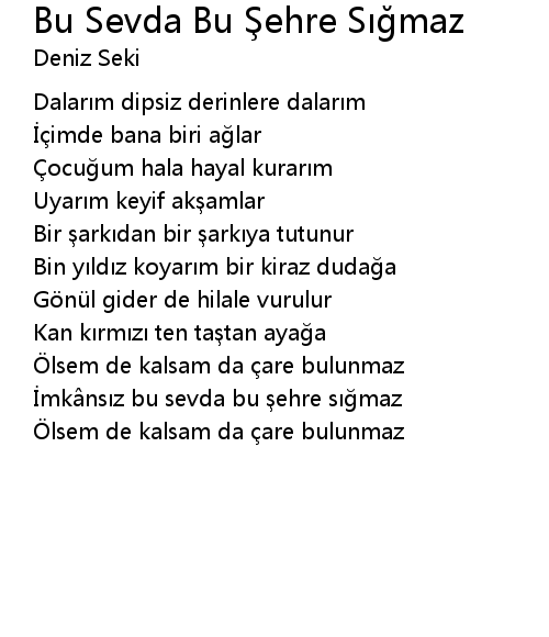 | Song | Bu Sevda Bu Şehre Sığmaz |