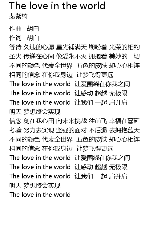 | The love in the world ràng wǒ men yì qǐ jiān bìng jiān | |