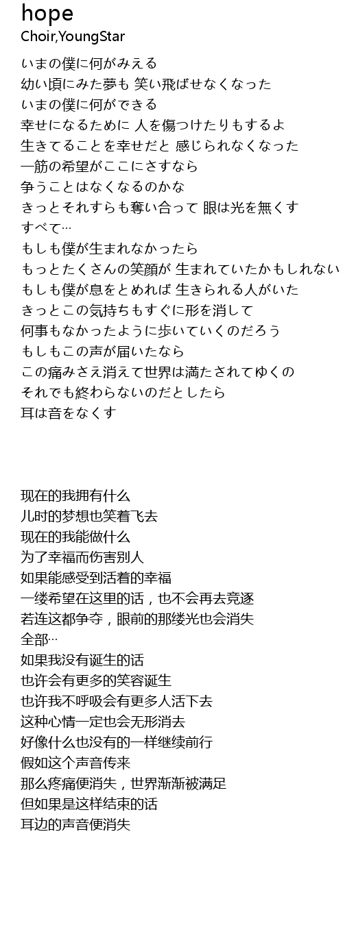 | [00:54.51] | 一筋の希望がここにさすなら 争うことはなくなるのかな |