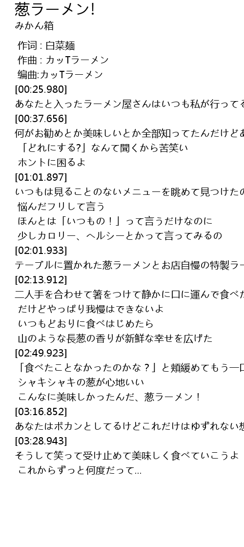 | [03:06.637] | こんなに美味しかったんだ、葱ラーメン! |