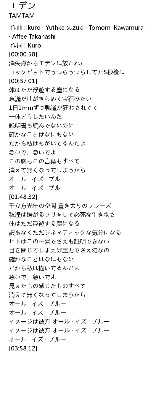 | [00:06.57] | 消失点からエデンに放たれた |