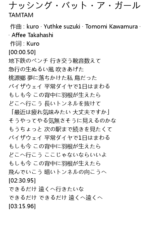 | [00:00.00] | zuò qǔ : kuro Yuthke suzuki Tomomi Kawamura Junet Kobayashi Affee Takahashi |