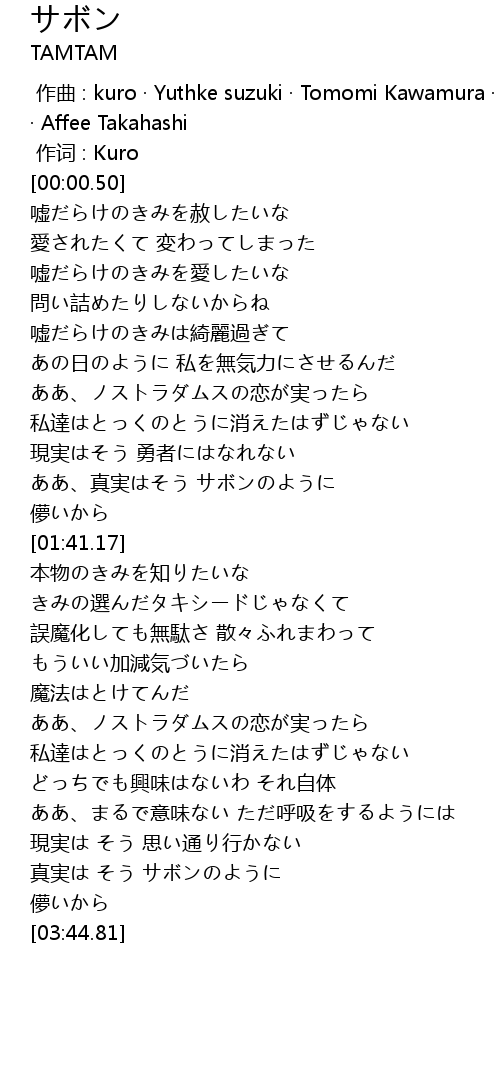 | [00:00.00] | zuo qu : kuro Yuthke suzuki Tomomi Kawamura Junet Kobayashi Affee Takahashi |