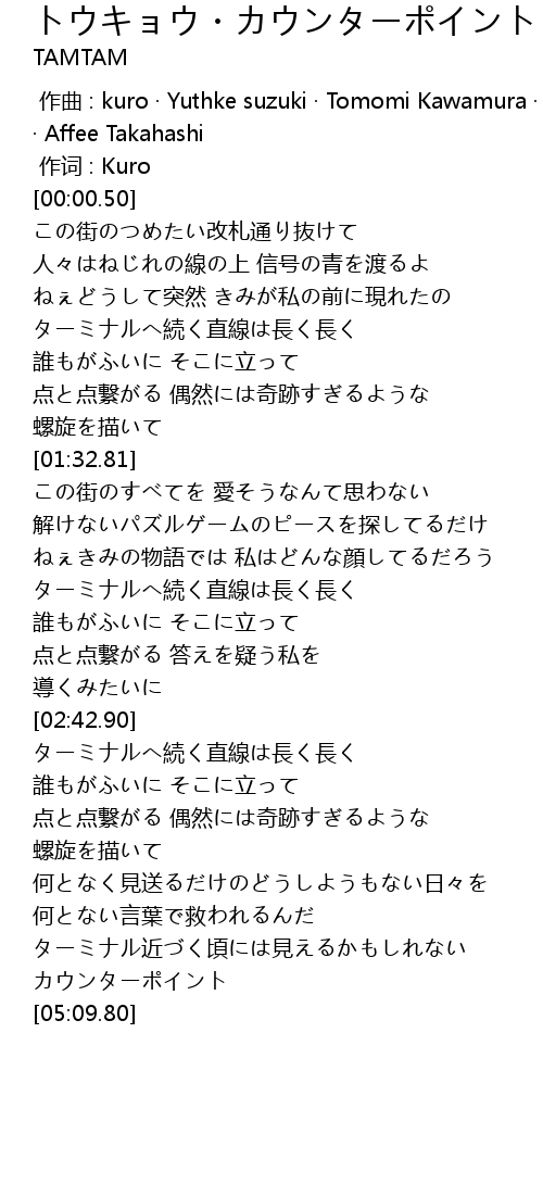 | [00:00.00] | zuo qu : kuro Yuthke suzuki Tomomi Kawamura Junet Kobayashi Affee Takahashi |