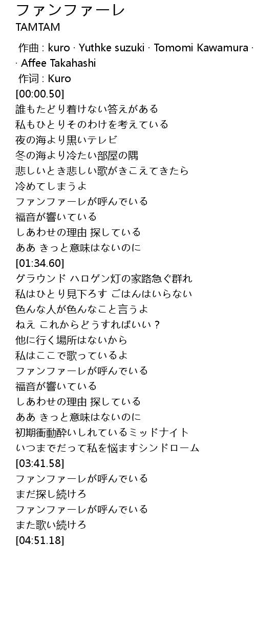 | [00:00.00] | zuo qu : kuro Yuthke suzuki Tomomi Kawamura Junet Kobayashi Affee Takahashi |