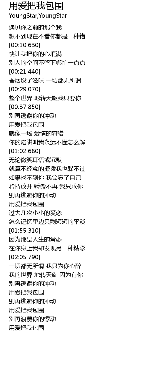 | [02:30.940] | yòng ài bǎ wǒ bāo wéi |