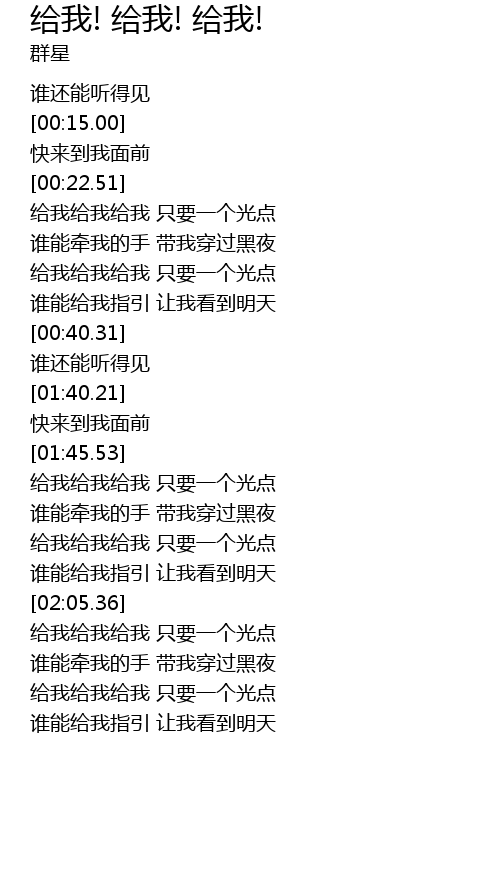 | [01:57.11] | gěi wǒ gěi wǒ gěi wǒ zhǐ yào yí gè guāng diǎn |