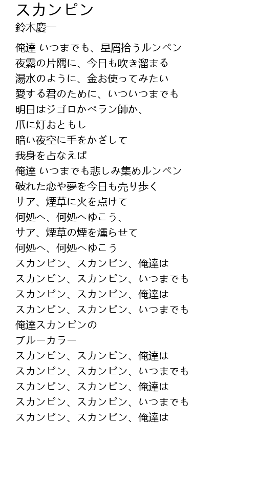 | [04:01.61] | スカンピン、スカンピン、俺達は |