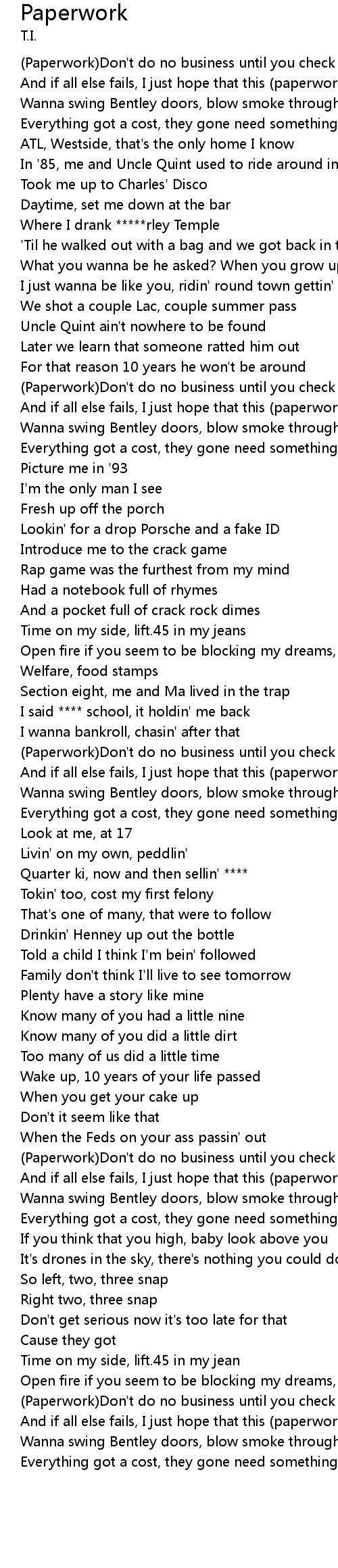 | [00:16.456] | Everything got a cost, they gone need something on you(Paperwork) |