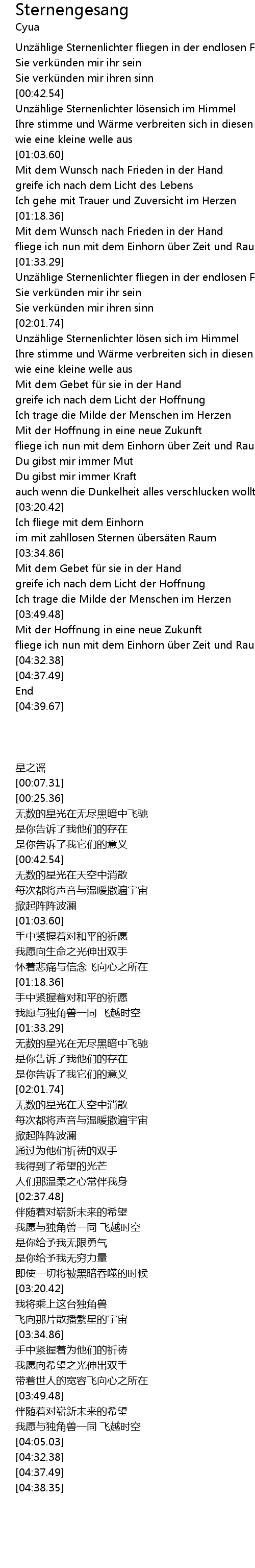 | [00:43.50] | Unzählige Sternenlichter lösensich im Himmel |