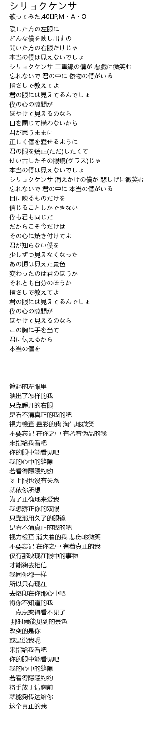 | [00:37.20] | シリョクケンサ 二重線の僕が 悪戯に微笑む |