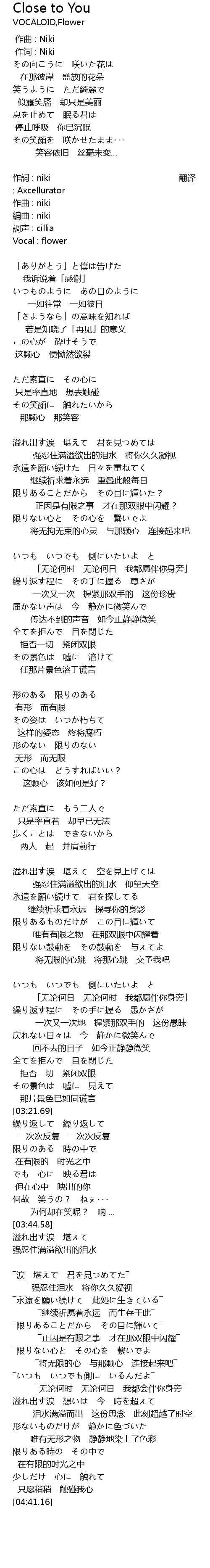 | [00:21.36] | 作詞 : niki 翻译 : Axcellurator |