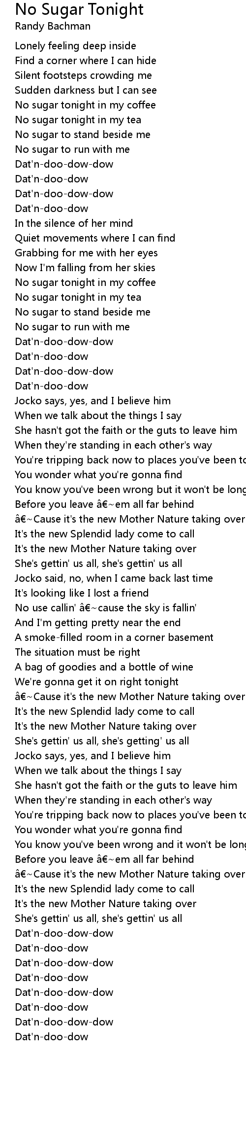 | No sugar tonight in my tea | |