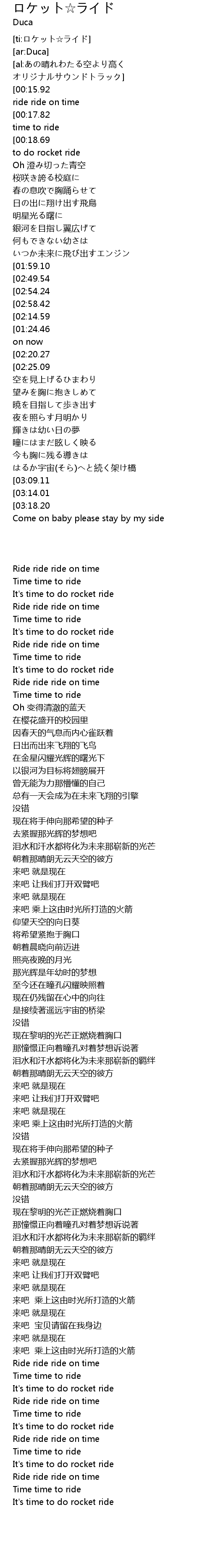 | [01:25.81][02:25.09][03:34.45][03:44.39] | Come on it' s a time to do rocket ride |