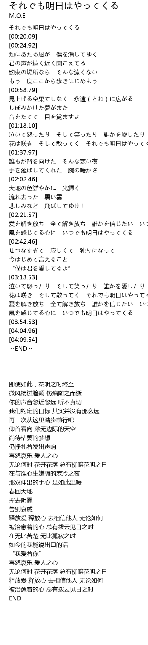 | [03:26.69] | 花は咲き そして散ってく それでも明日はやってくる |
