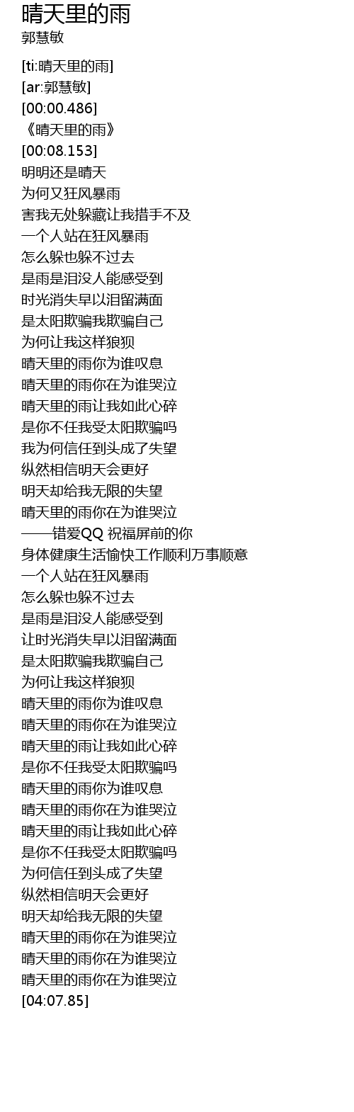 | [03:57.436] | 晴天里的雨你在为谁哭泣 |