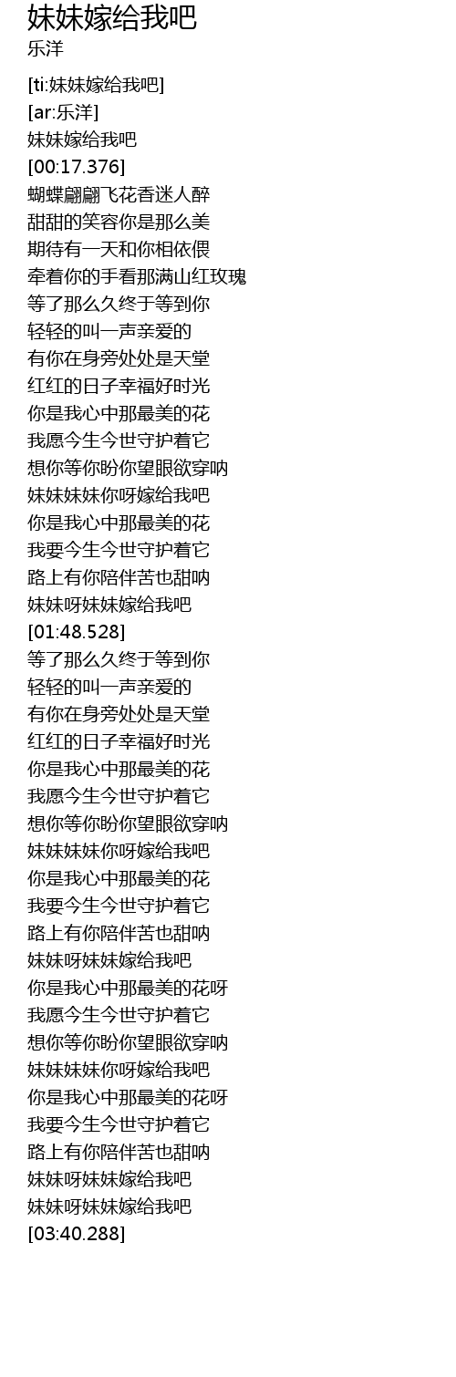 | [01:28.938] | 妹妹呀妹妹嫁给我吧 |