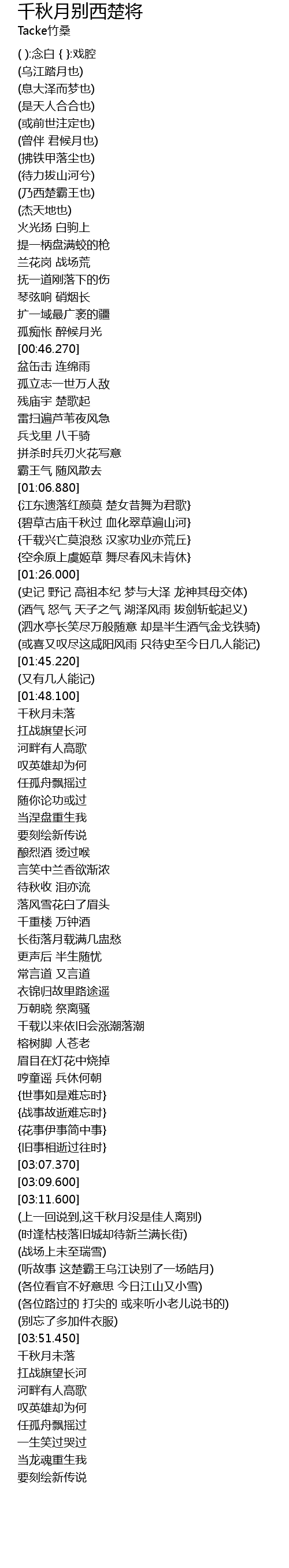 | [03:39.850] | (听故事 这楚霸王乌江诀别了一场皓月) |