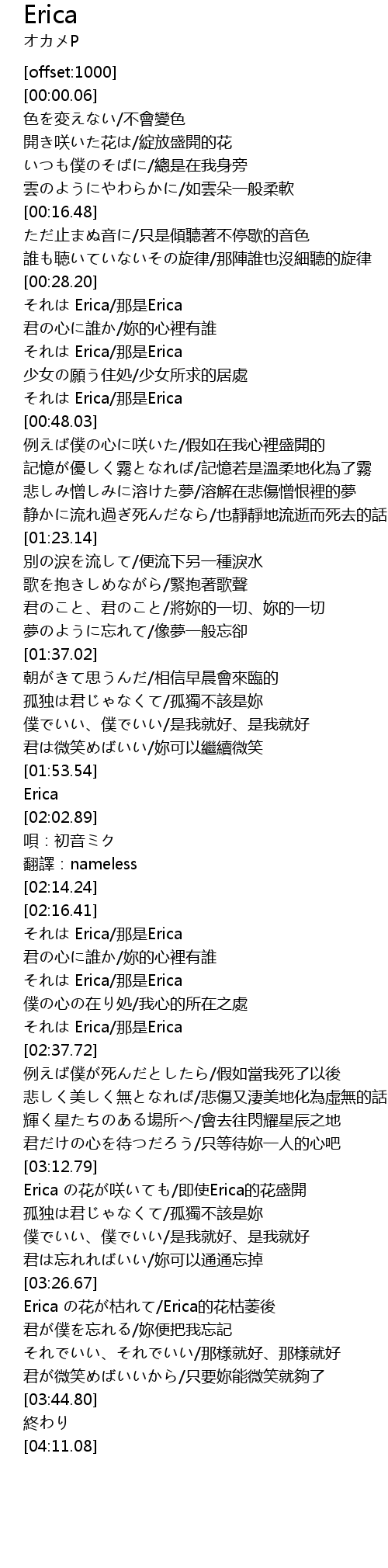 | [03:13.08] | Erica hua xiao ji shi Erica de hua sheng kai |