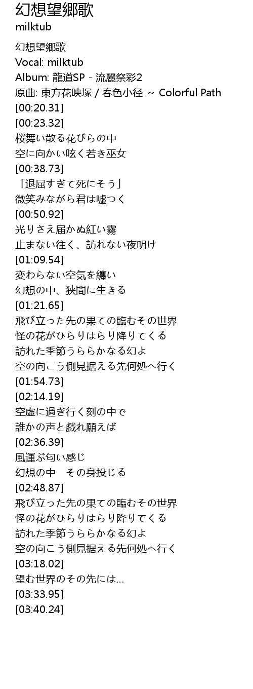 | [00:12.92] | 原曲: 東方花映塚 / 春色小径 ~ Colorful Path |