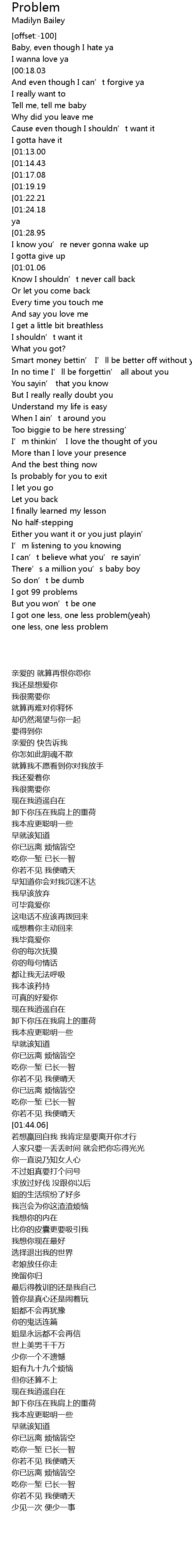 | [00:40.92][01:24.18][01:33.86][02:27.74][02:37.10] | I got one less problem without ya |