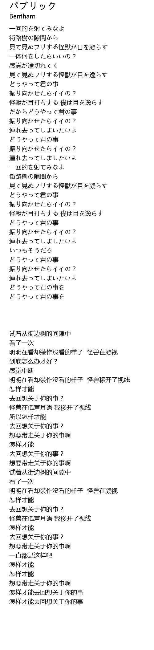 | [00:56.15] | 怪獣が耳打ちする 僕は目を逸らす |