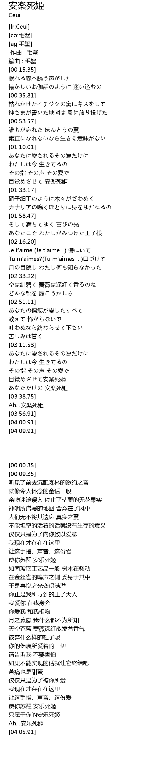 | [00:17.35] | 眠れる森へ誘う声がした |