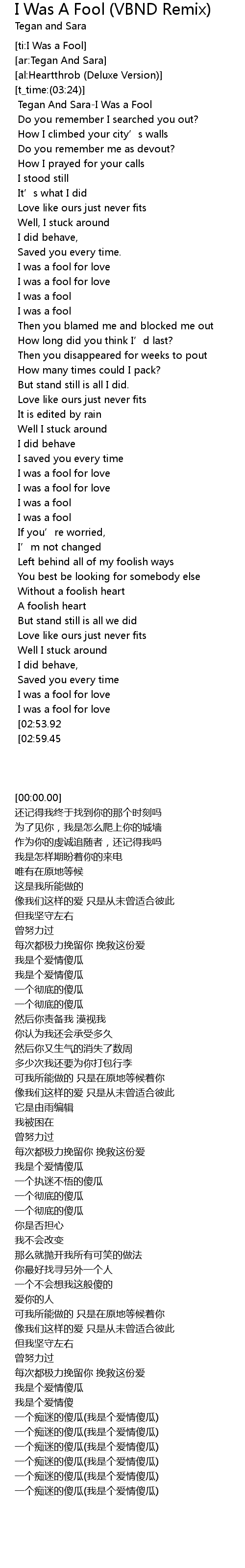 | [00:00.00] | Tegan And SaraI Was a Fool |