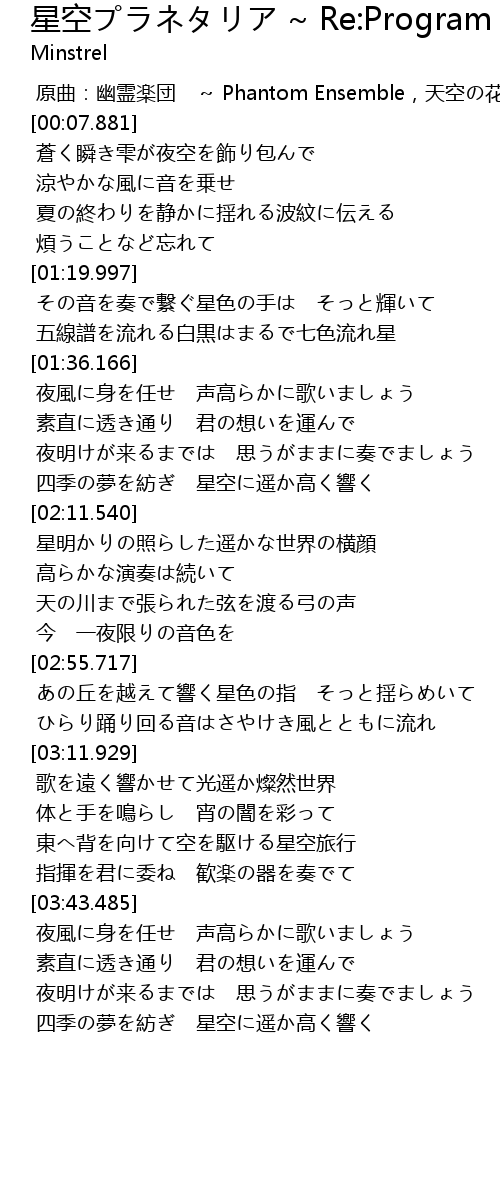 | [03:27.904] | 東へ背を向けて空を駆ける星空旅行 |