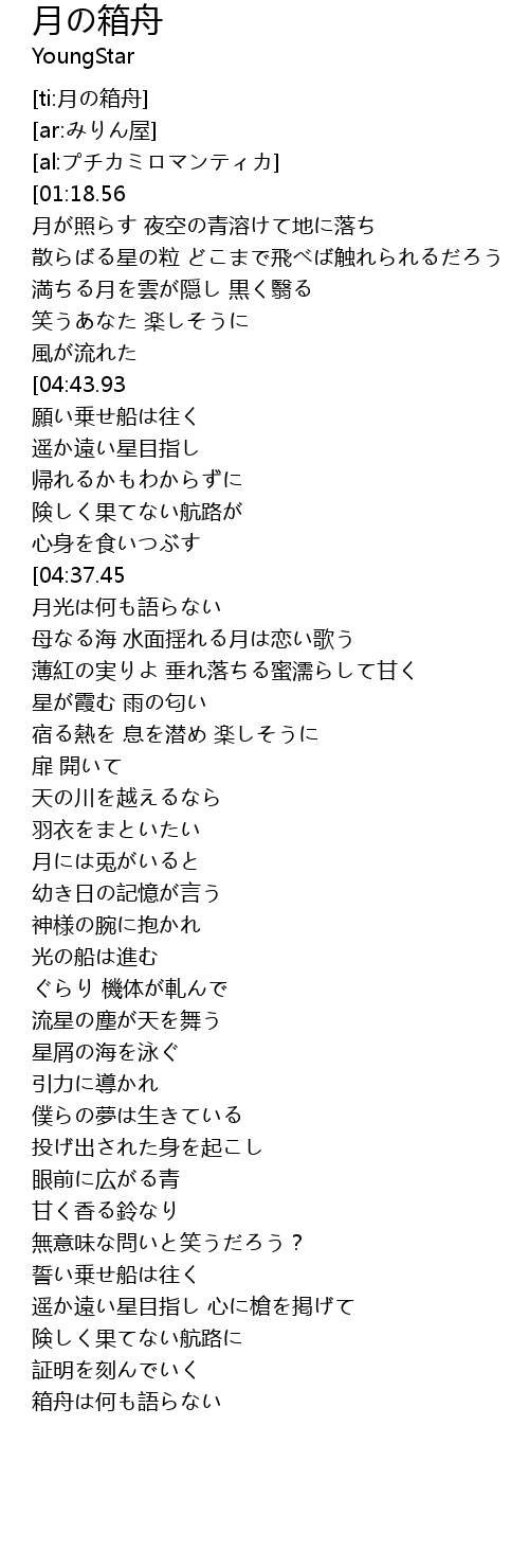 | [01:45.63][04:43.93] | 夜の闇を泳ぐように |
