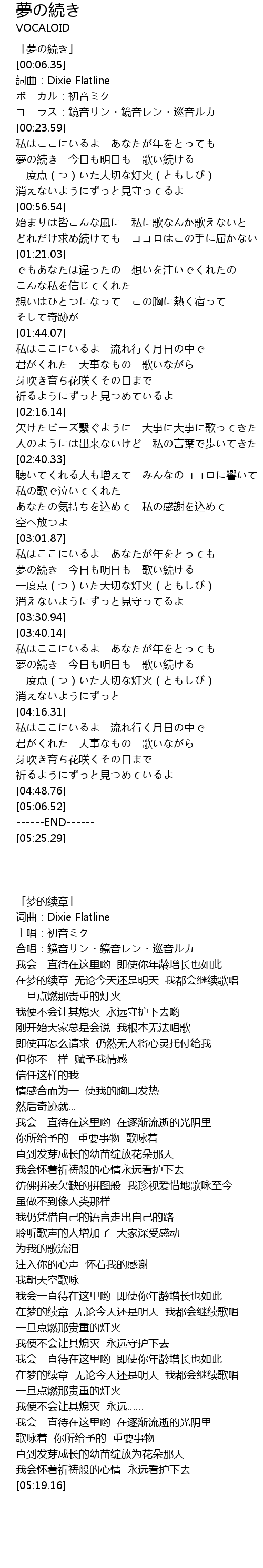 | [00:33.12] | 夢の続き 今日も明日も 歌い続ける |