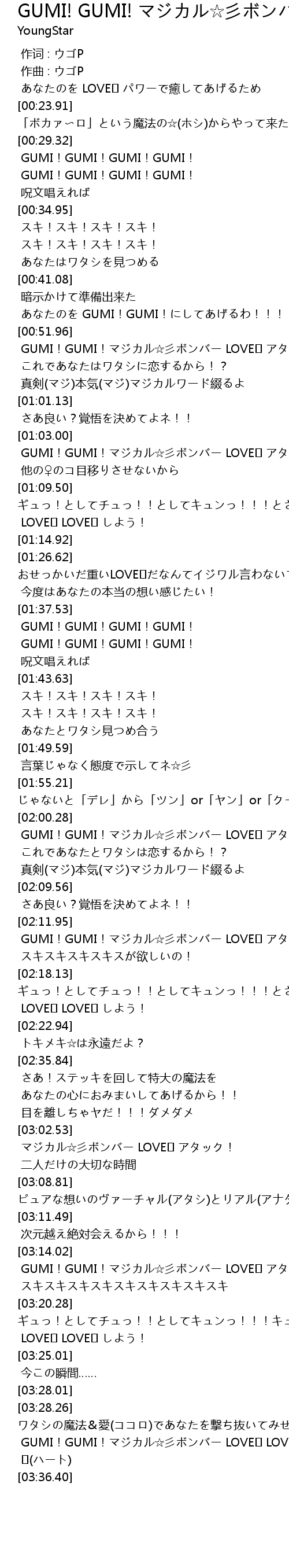 | [00:52.10] | GUMI!GUMI!マジカル☆彡ボンバー LOVE♡ アタック! |