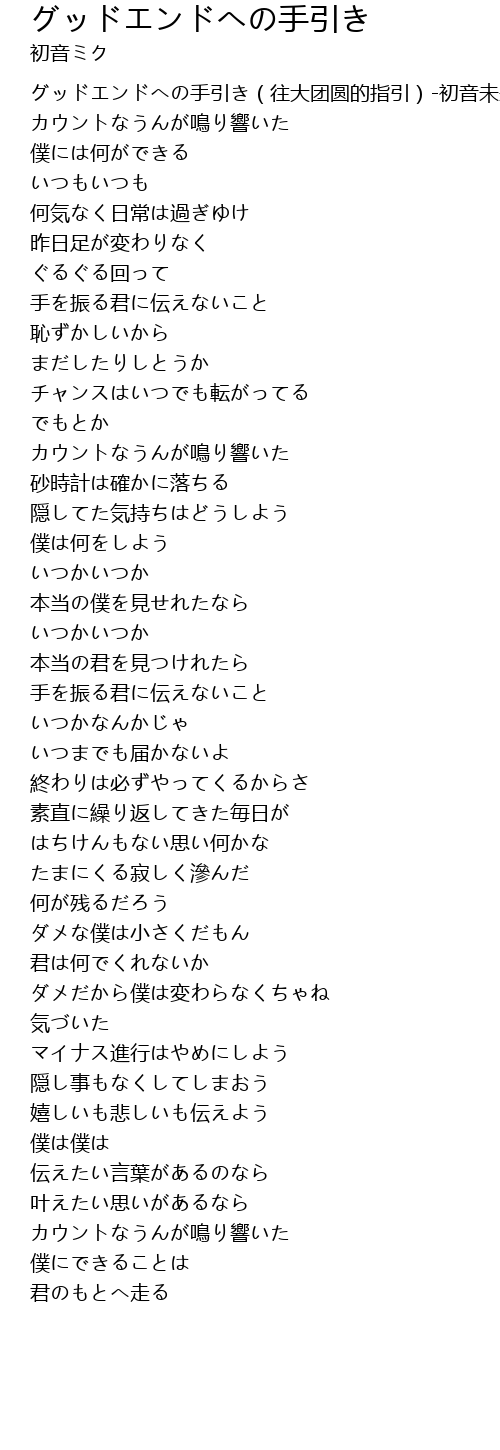| [00:00.00] | グッドエンドへの手引き(往大团圆的指引)-初音未来(音ミク) |