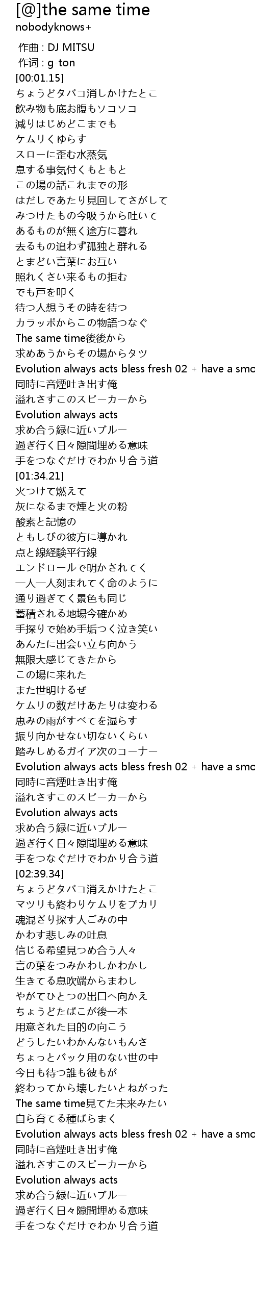| [01:15.22] | Evolution always acts bless fresh 02 + have a smoking |