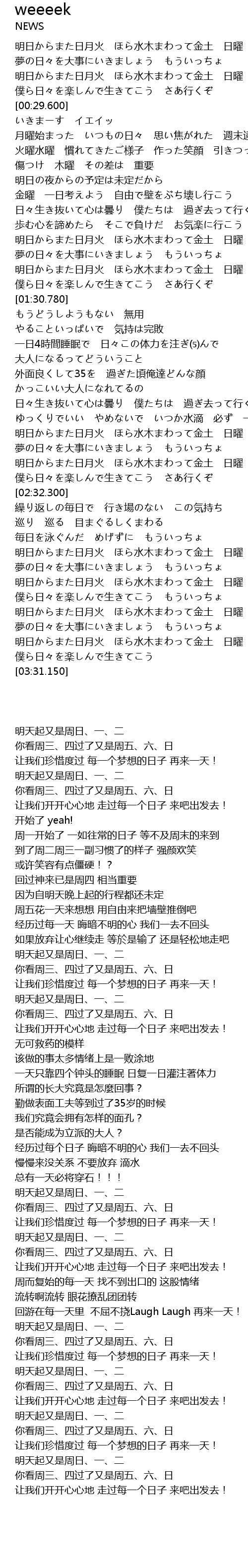 | [01:11.100] | 明日からまた日月火 ほら水木まわって金土 日曜 |