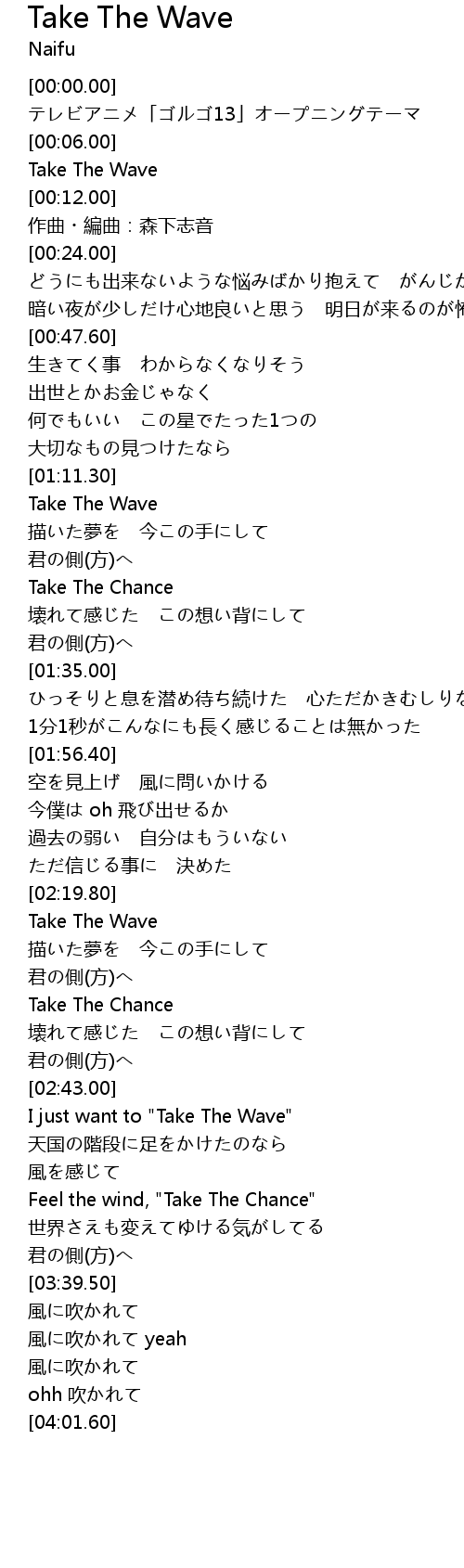 | [01:11.80] | Take The Wave |