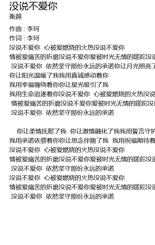 | 没说不爱你 心被爱燃烧的火热没说不爱你 情被爱痛苦的折磨没说不爱你爱被时光无情的蹉跎没说不爱你 没说不爱你 依然坚守那份永远的承诺 |