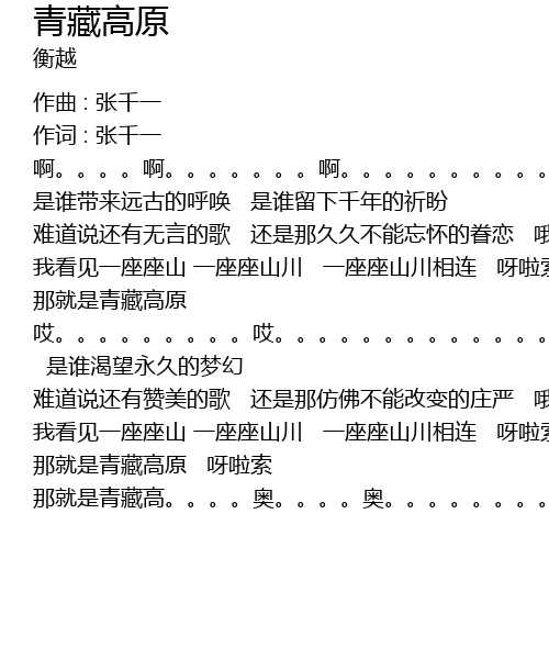 | a.... a....... a.......... shì shuí dài lái yuǎn gǔ de hū huàn shì shuí liú xià qiān nián de qí pàn nán dào shuō hái yǒu wú yán de gē hái shì nà jiǔ jiǔ bù néng wàng huái de juàn liàn ó wǒ kàn jiàn yī zuò zuò shān yī zuò zuò shān chuān yī zuò zuò shān chuān xiāng lián ya la suǒ nà jiù shì qīng zàng gāo yuán āi......... āi................ shì shuí rì yè yáo wàng zhe lán tiān shì shuí kě wàng yǒng jiǔ de mèng huàn nán dào shuō hái yǒu zàn měi dí gē hái shì nà fǎng fú bù néng gǎi biàn de zhuāng yán ó wǒ kàn jiàn yī zuò zuò shān yī zuò zuò shān chuān yī zuò zuò shān chuān xiāng lián ya la suǒ nà jiù shì qīng zàng gāo yuán ya la suǒ nà jiù shì qīng zàng gāo.... ào.... ào.......... ào............... yuán...... |